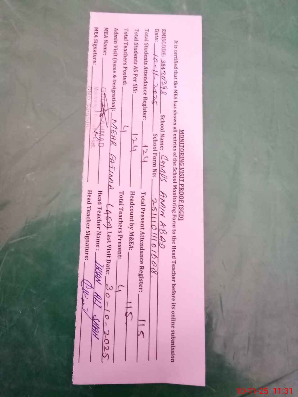 | Attendance Register | Head Teacher | MEA with School | Visit Proof |