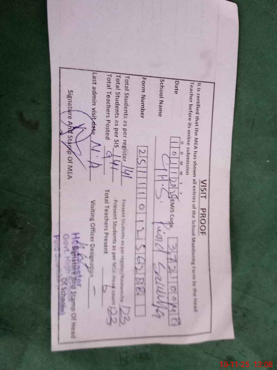 | Attendance Register | Head Teacher | MEA with School | Visit Proof |