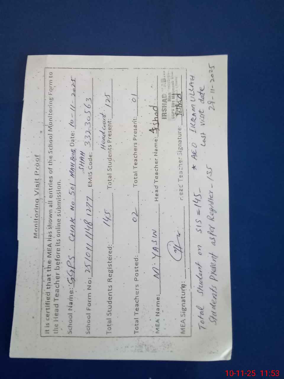 | Attendance Register | Head Teacher | MEA with School | Visit Proof |
