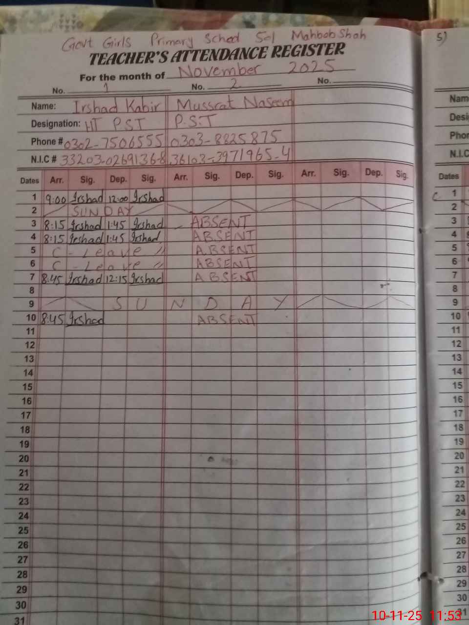 | CNIC | Full Name | Designation | R/C | Absence During Last Calender Month |