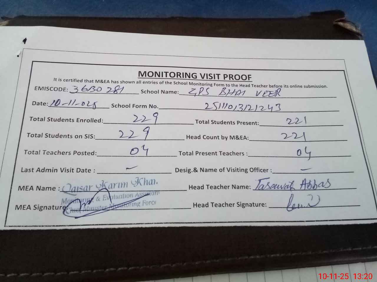 | Attendance Register | Head Teacher | MEA with School | Visit Proof |