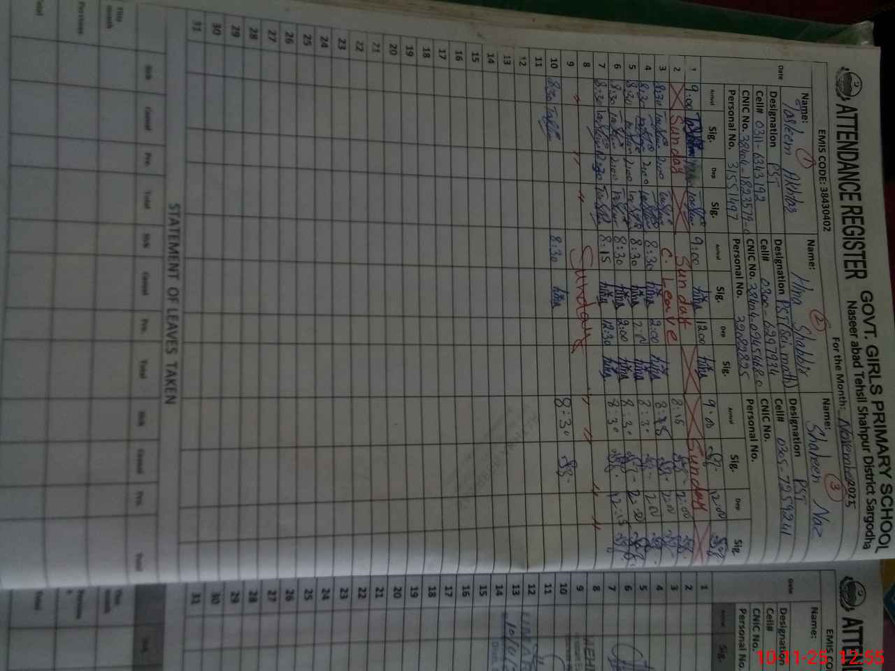 | CNIC | Full Name | Designation | R/C | Absence During Last Calender Month |