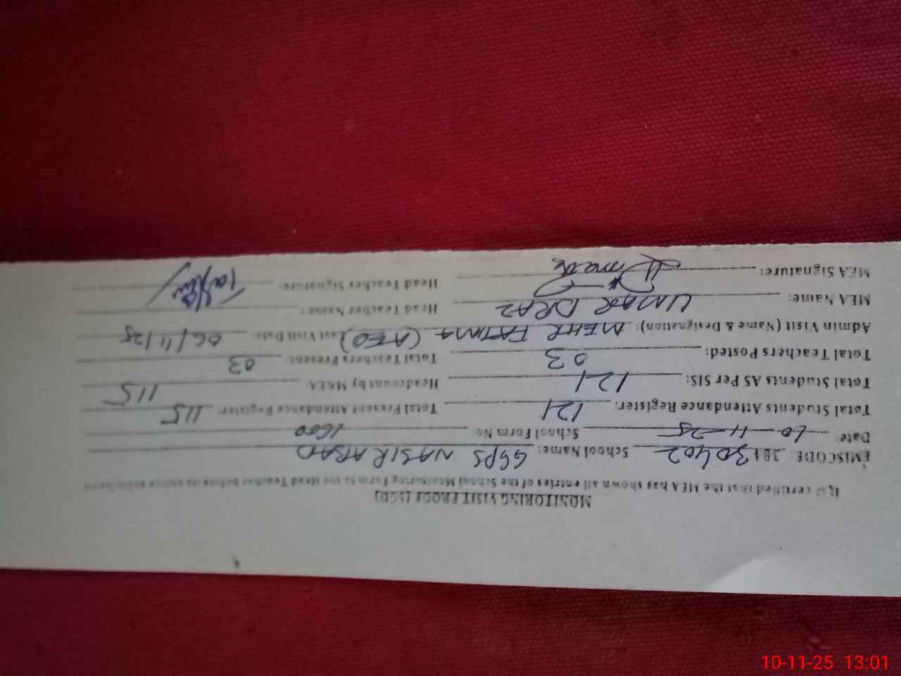| Attendance Register | Head Teacher | MEA with School | Visit Proof |