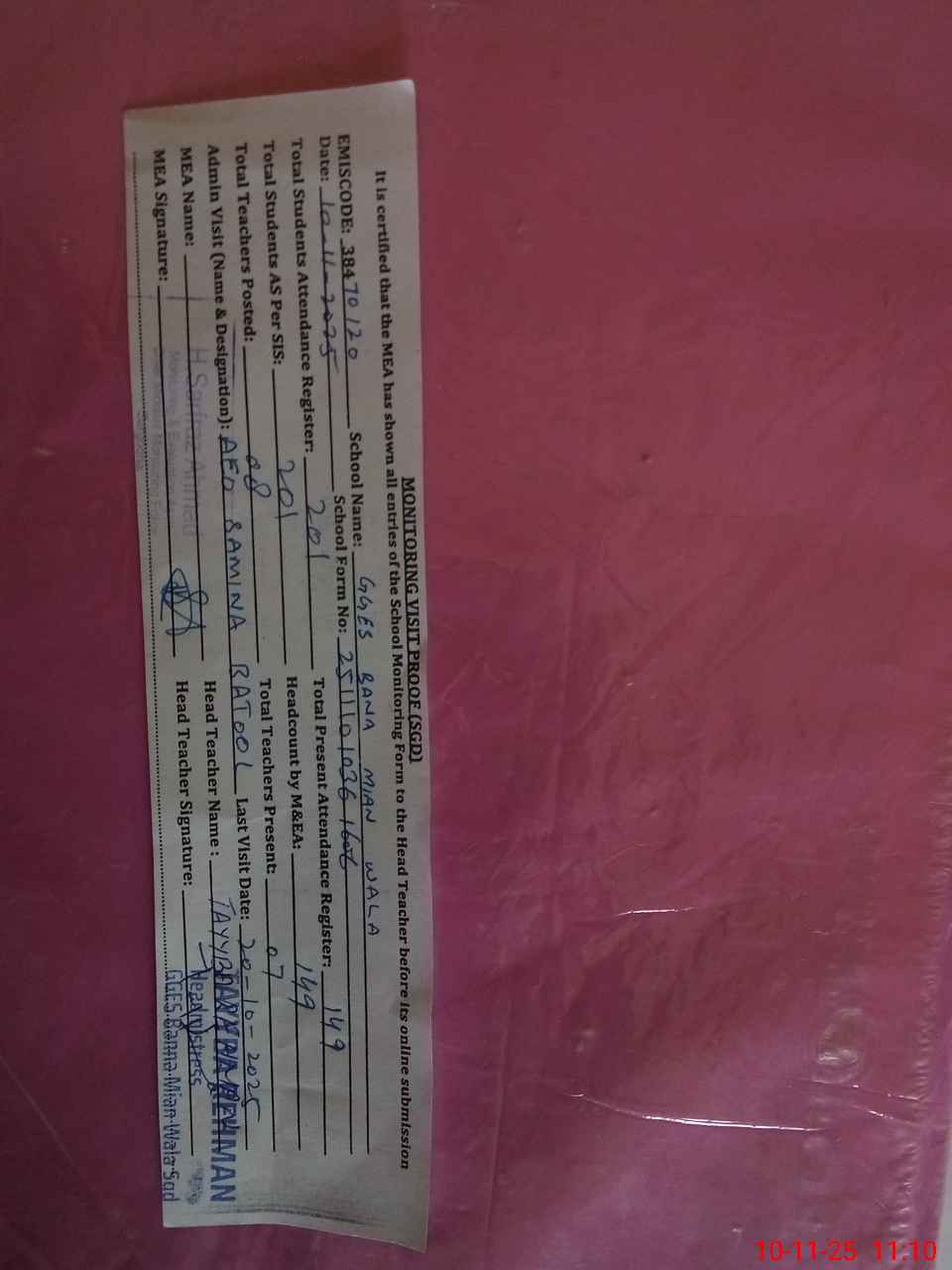 | Attendance Register | Head Teacher | MEA with School | Visit Proof |
