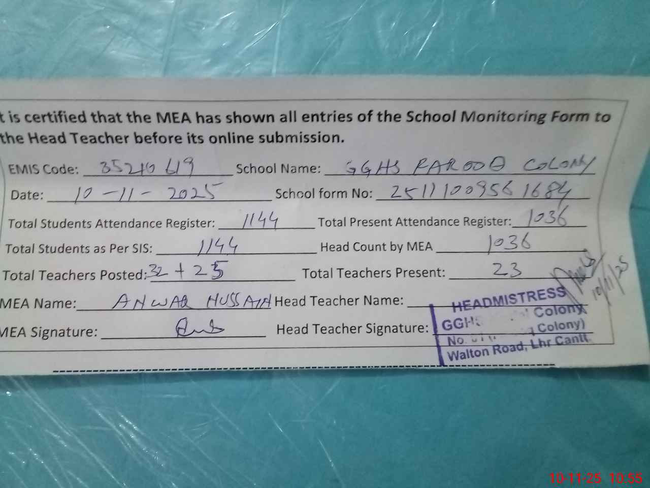 | Attendance Register | Head Teacher | MEA with School | Visit Proof |