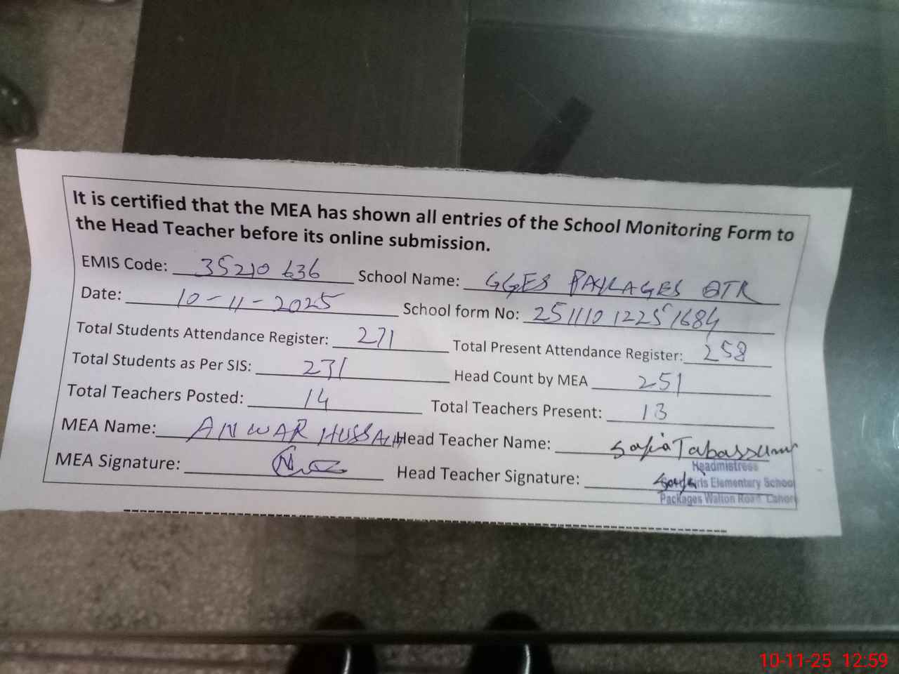 | Monitoring Date: 10-11-2025 | Start Time: 10-11-2025 12:25 PM | End Time: 10-11-2025 12:59 PM | Name of MEA: AN**** HU**** | |