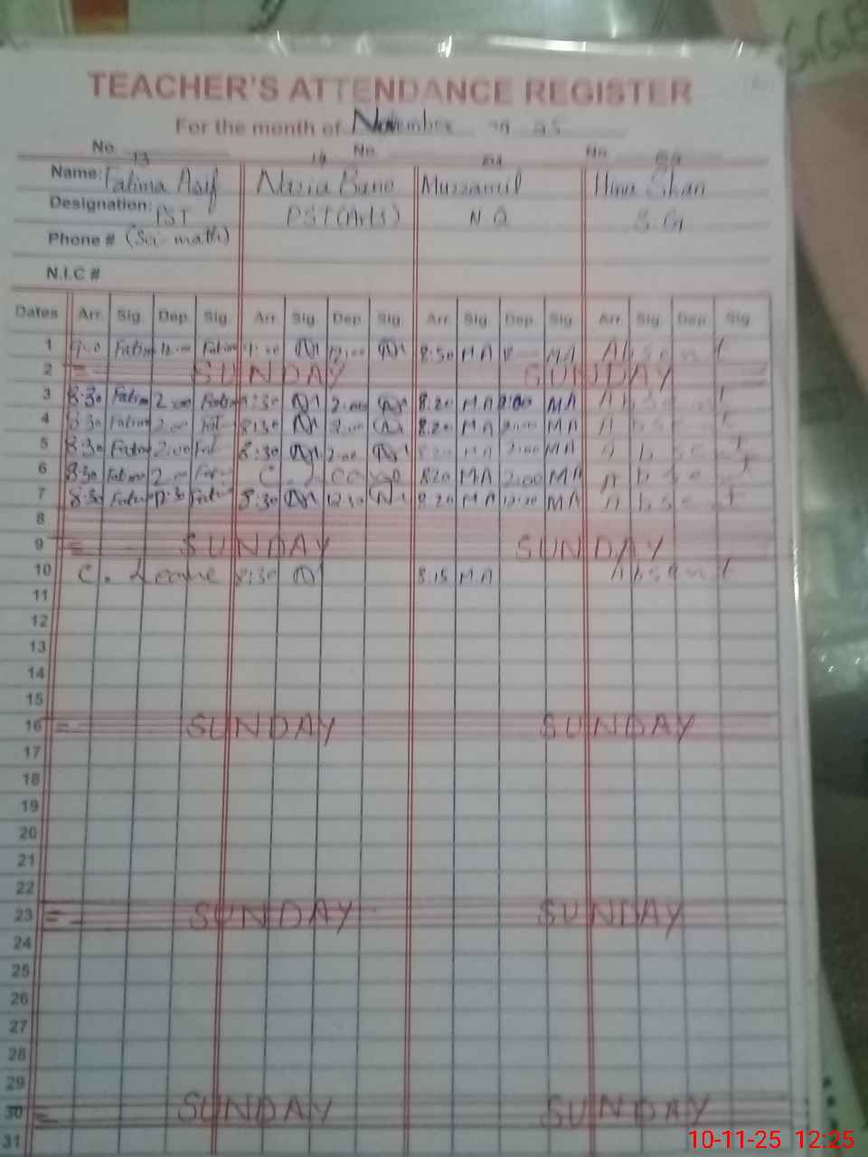 | CNIC | Full Name | Designation | R/C | Absence During Last Calender Month |