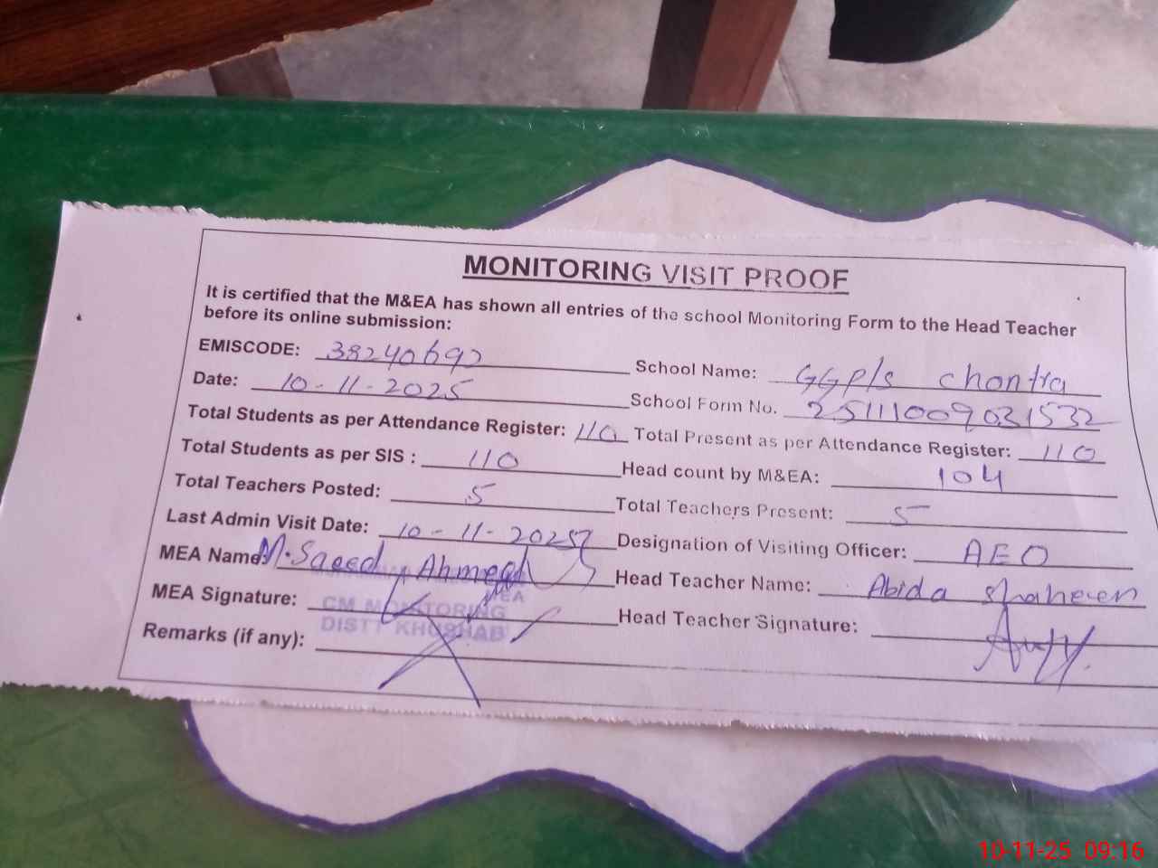 | Remarks (Use Separate Page if Required): Students on SIS QTY 110 Last admin visit 10 November 2025 by AEO | |||||