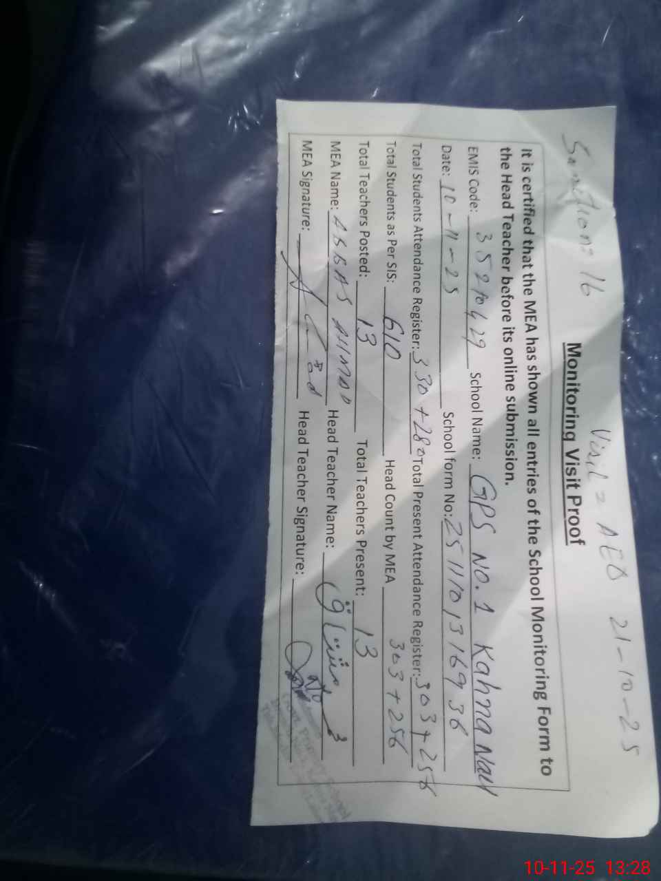 | Attendance Register | Head Teacher | MEA with School | Visit Proof |