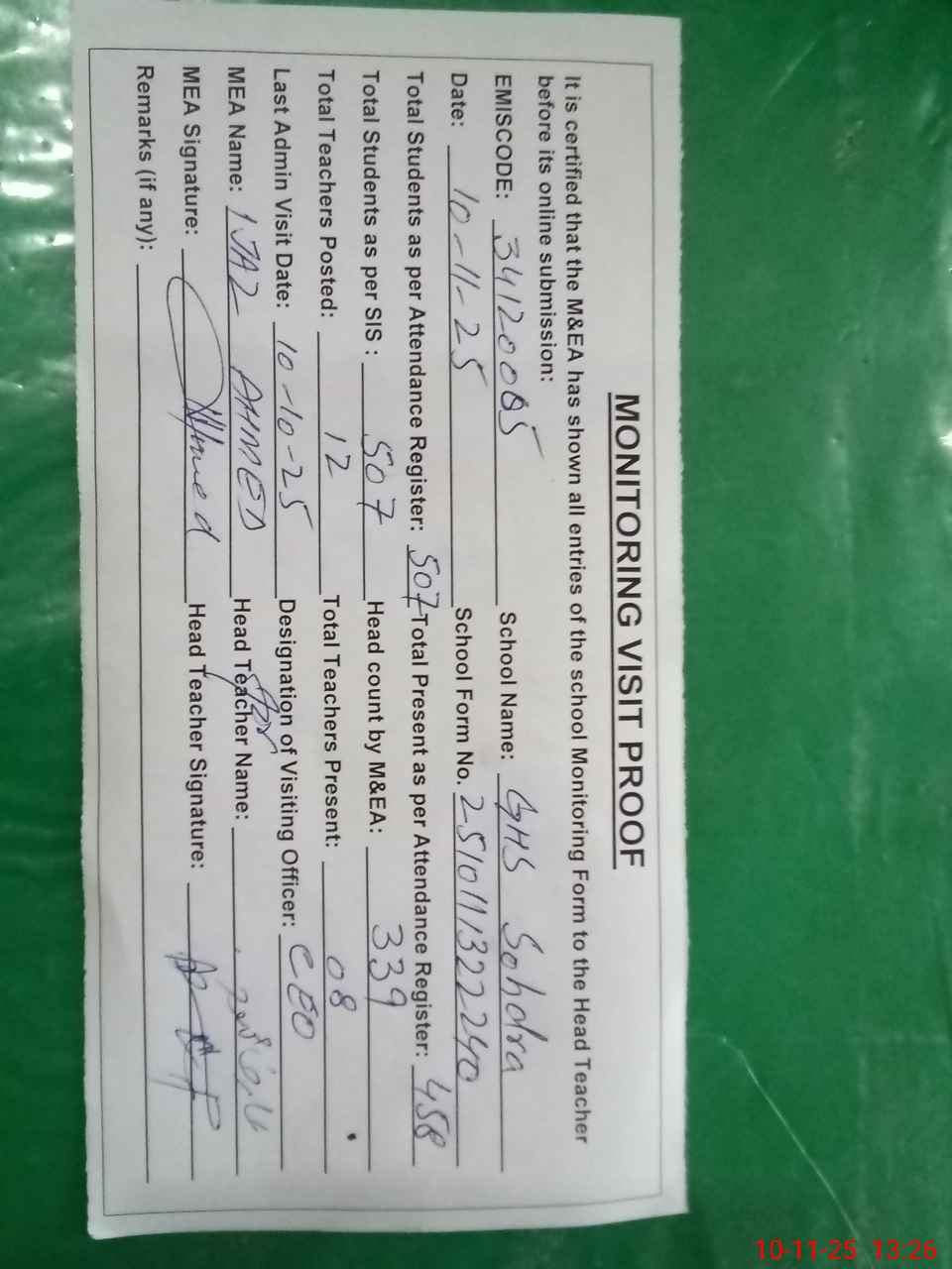 | Attendance Register | Head Teacher | MEA with School | Visit Proof |