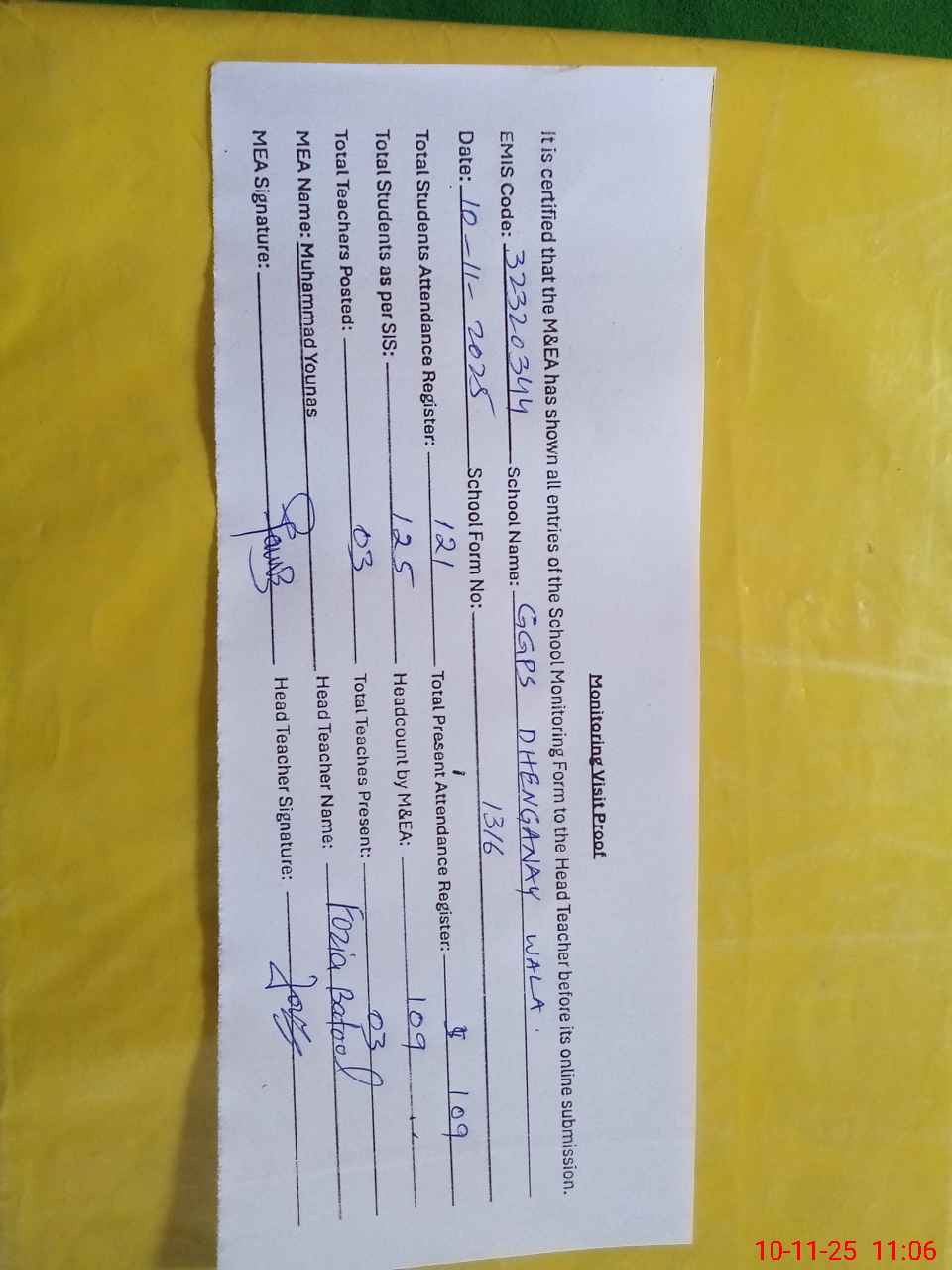 | Attendance Register | Head Teacher | MEA with School | Visit Proof |