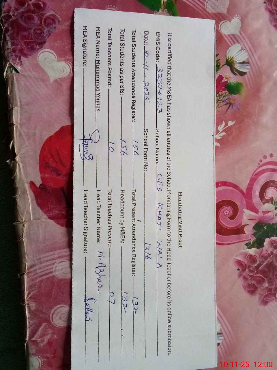 | Attendance Register | Head Teacher | MEA with School | Visit Proof |