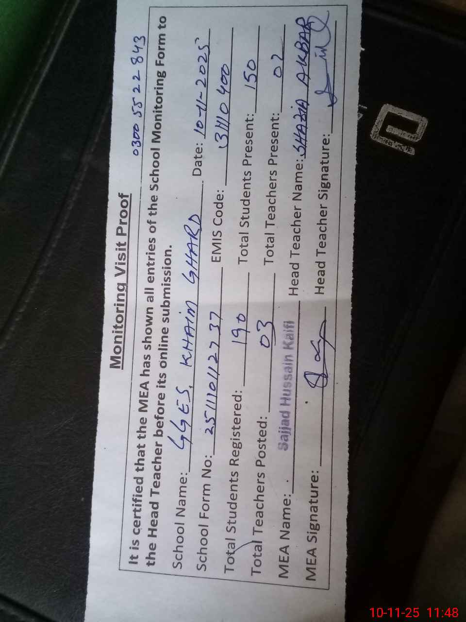 | Monitoring Date: 10-11-2025 | Start Time: 10-11-2025 11:27 AM | End Time: 10-11-2025 11:50 AM | Name of MEA: Sa**** Hu**** Ka**** BN**** 17 | |