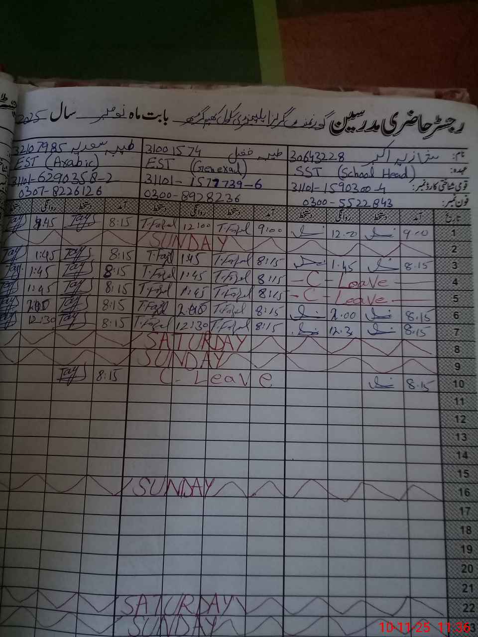 | CNIC | Full Name | Designation | R/C | Absence During Last Calender Month |