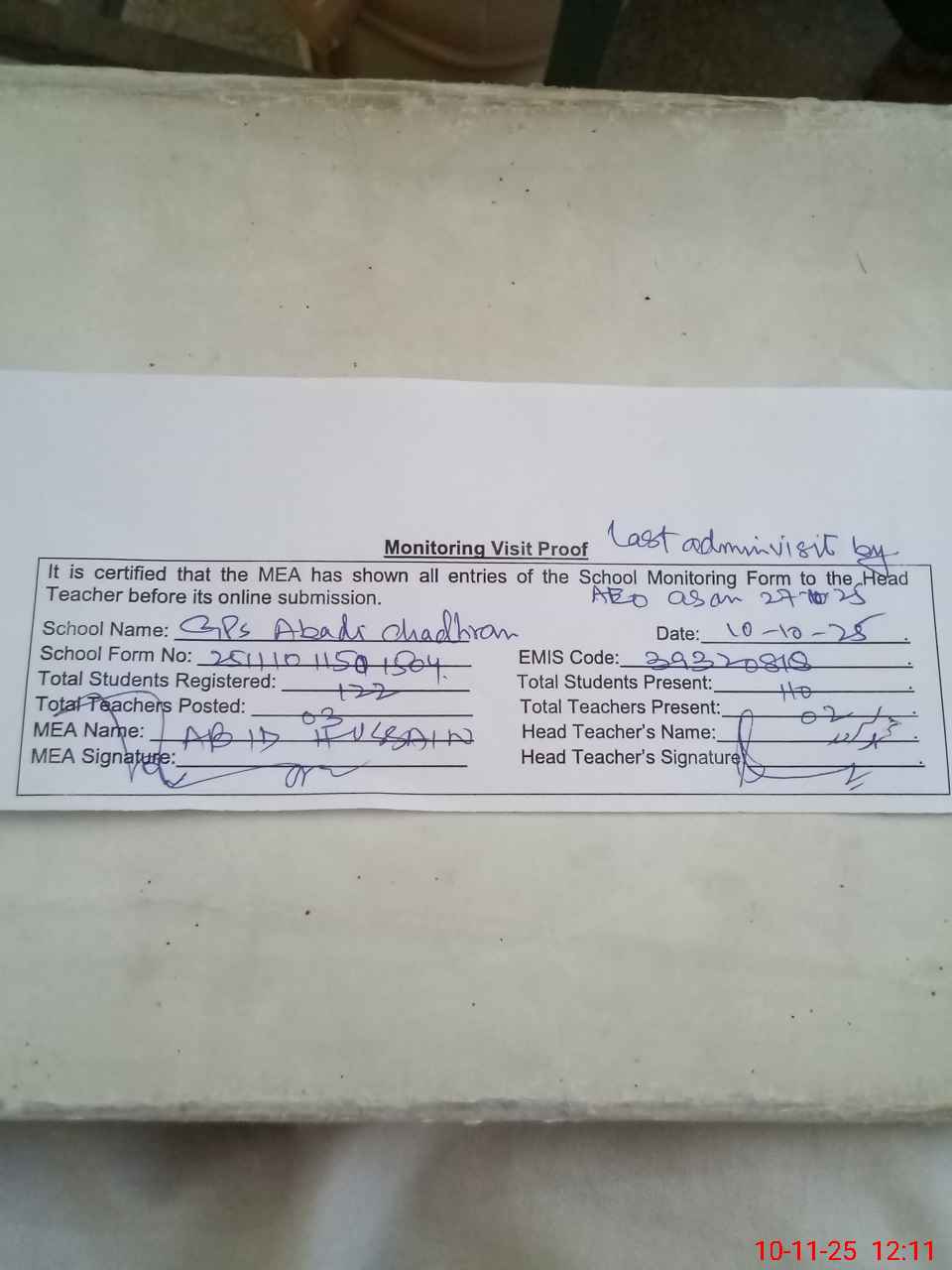 | Remarks (Use Separate Page if Required): Last Administrator visit by AEO as on 27 October 2025 | |||||