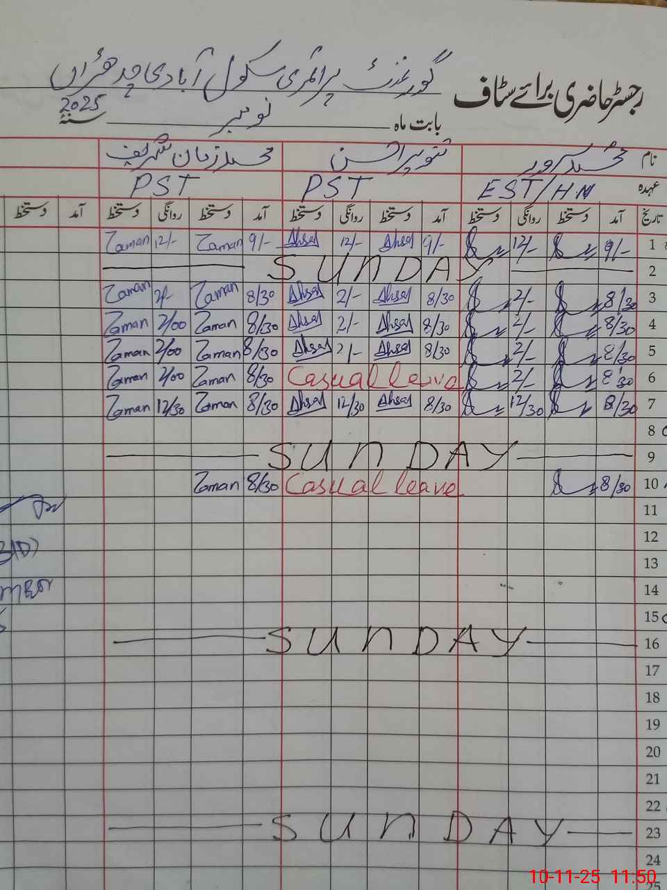 | CNIC | Full Name | Designation | R/C | Absence During Last Calender Month |