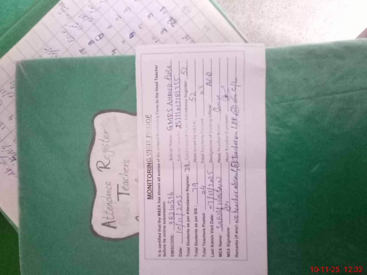 | Remarks (Use Separate Page if Required): No teacher absent 01 teacher on LPR 01 teacher on casual leave Last admin visit by AEO on 07 Nov 2025 | |||||