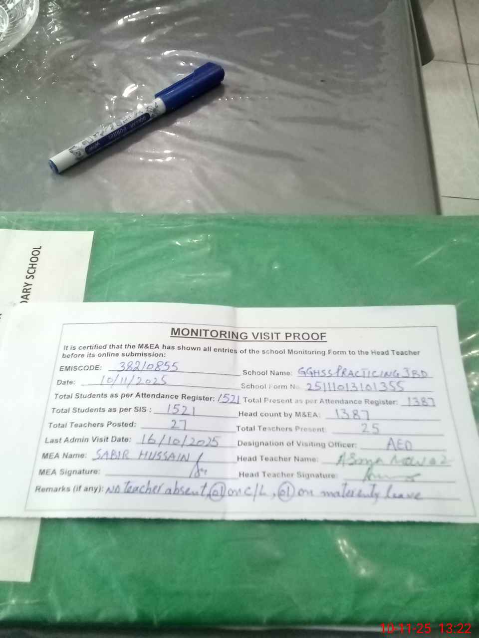 | Remarks (Use Separate Page if Required): No teacher absent 01 teacher on casual leave 01 teacher matrenty leave Last admin visit by AEO 16 Oct 2025 | |||||