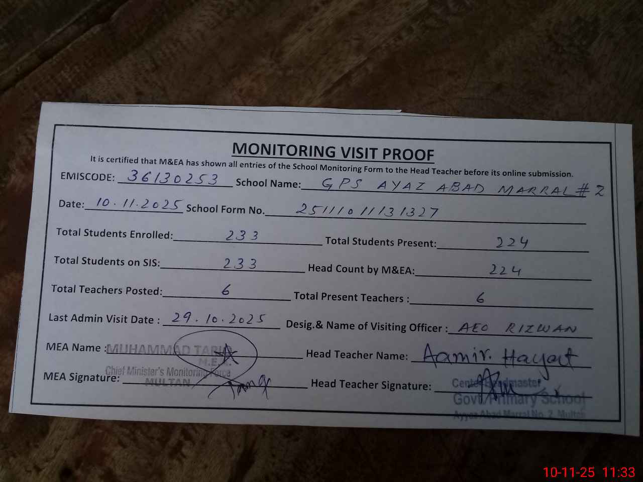| Attendance Register | Head Teacher | MEA with School | Visit Proof |