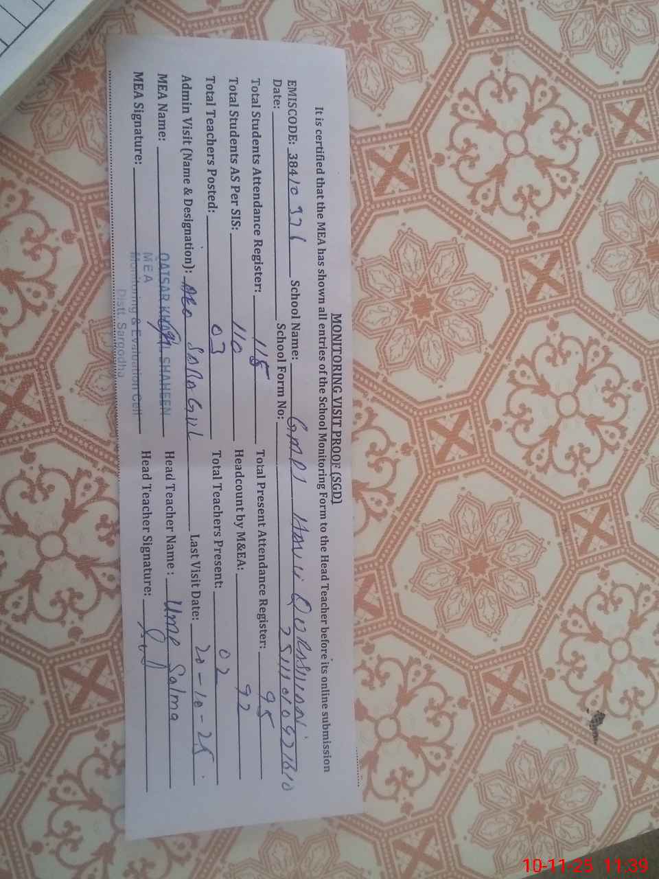 | Attendance Register | Head Teacher | MEA with School | Visit Proof |