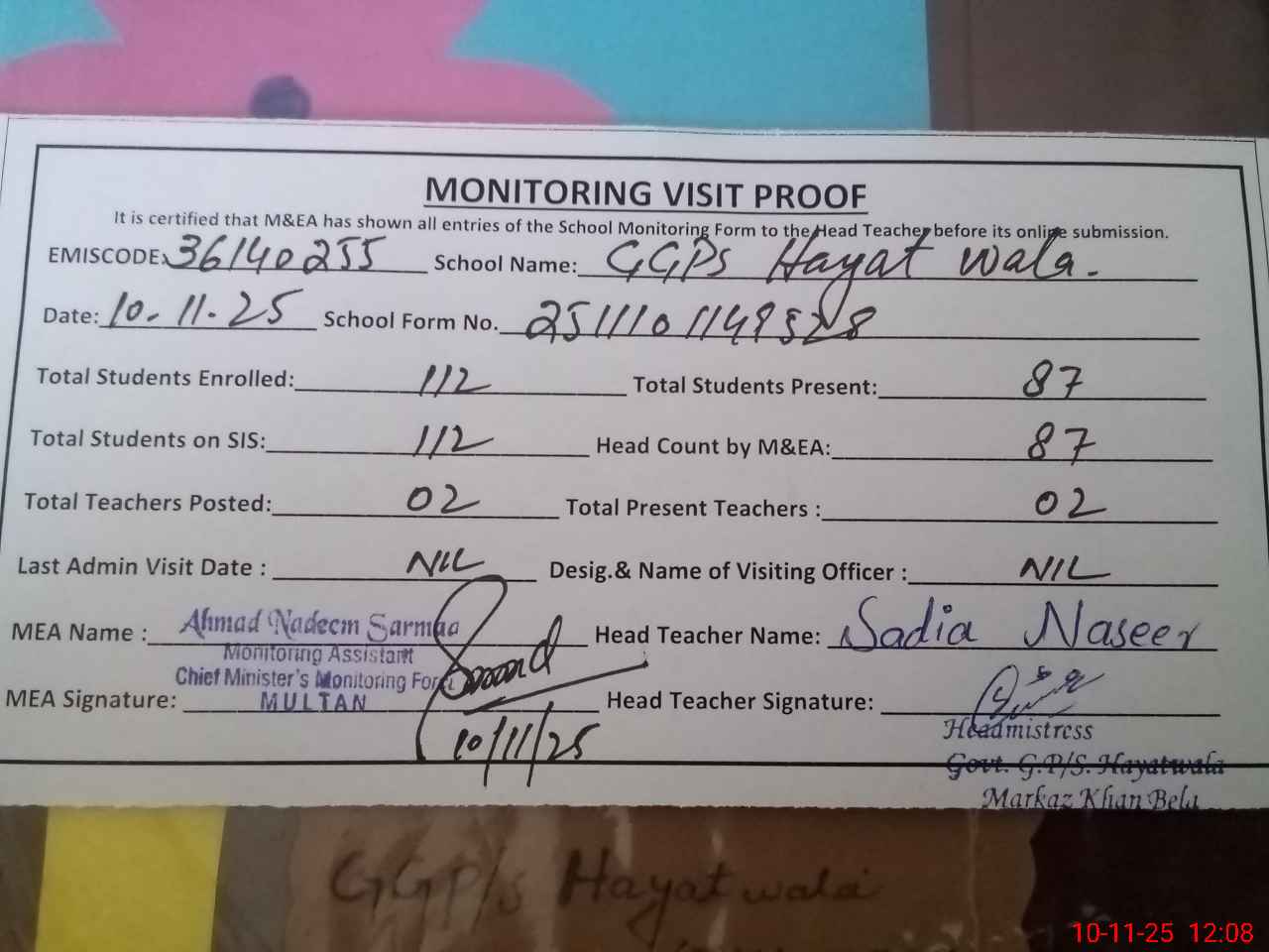 | EMIS Code: 36140255 | Name of School: GGPS HAYAT WALA | |||