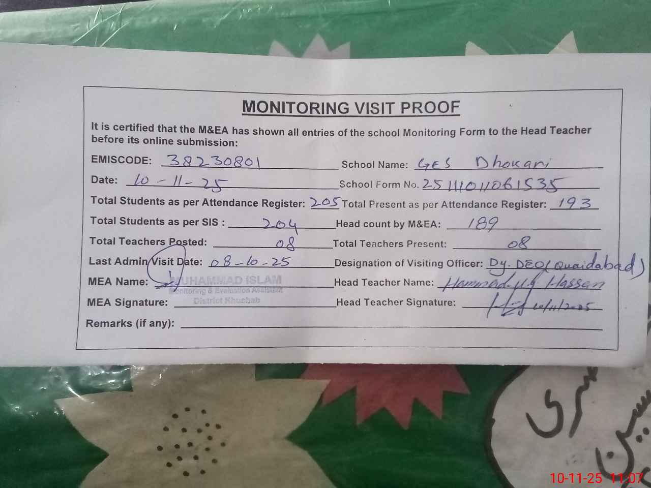 | Remarks (Use Separate Page if Required): Dy DEO visited school on 8 October 2025 | |||||