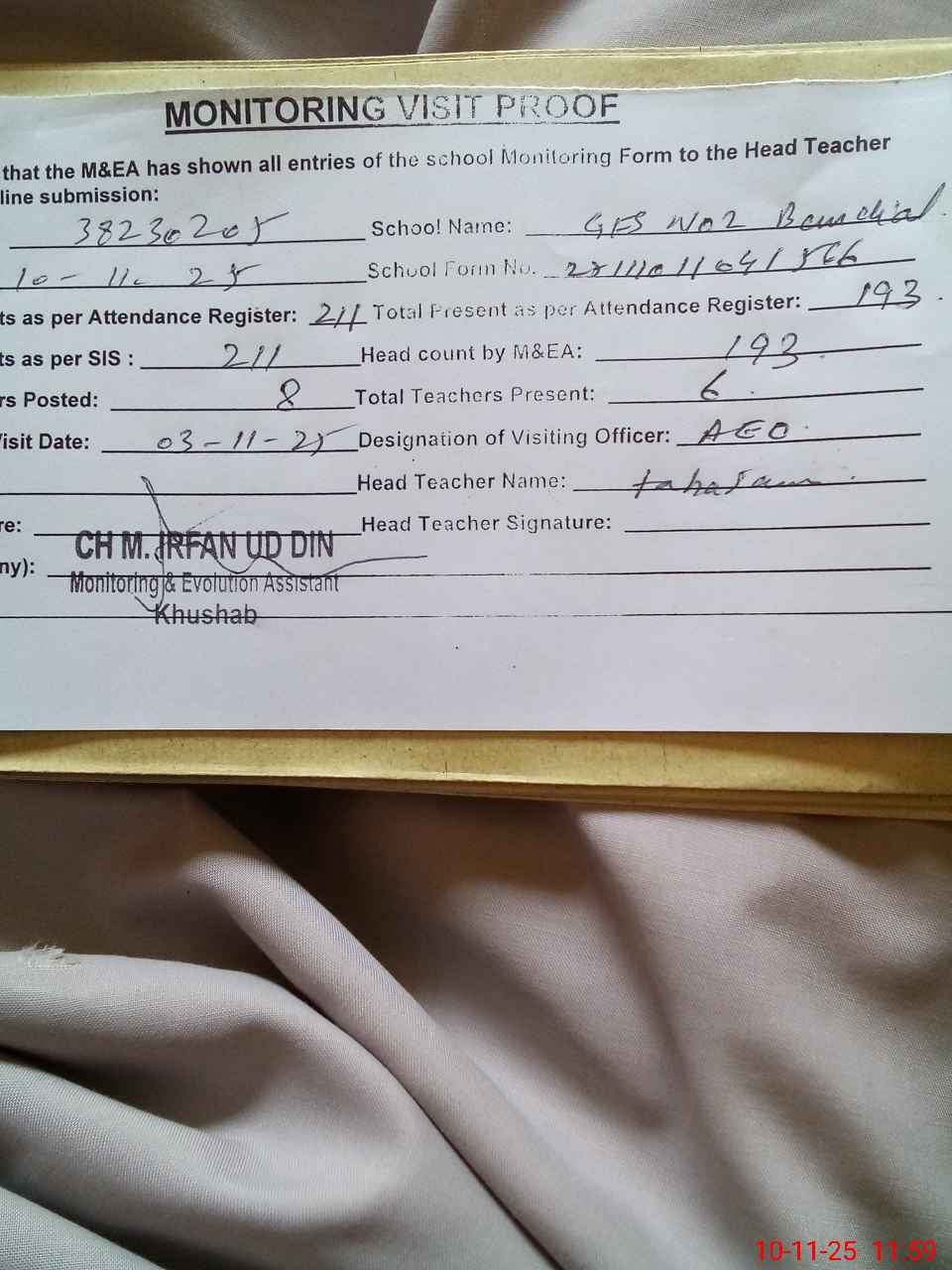 | Remarks (Use Separate Page if Required): GES no 2 bandial Emis code 38230205 Student on sis 211 Students on register 211 Head count 193 No teacher absent 2 on leave Last visit 3 Oct aeo Missing facility 63 student chair needed | |||||