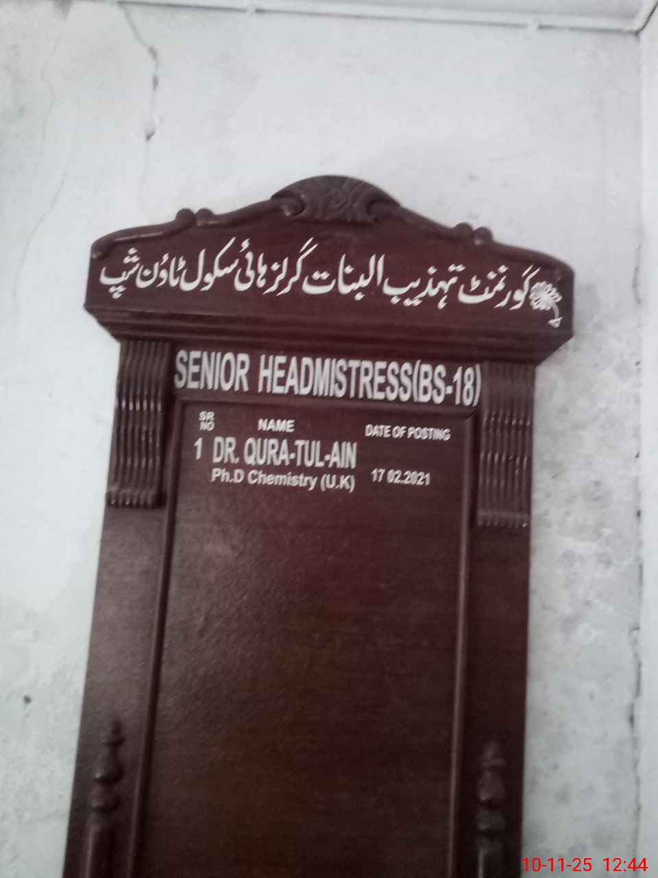 | Name: DrQu**** UlAi**** Designation: (School Headmaster's/Headmistress's) Head Mistress Phone/Cell Number: 03**** |