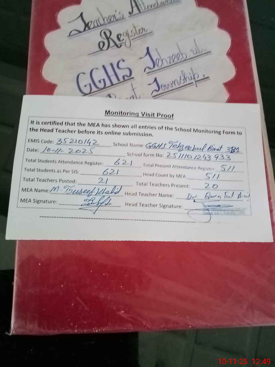 | Attendance Register | Head Teacher | MEA with School | Visit Proof |