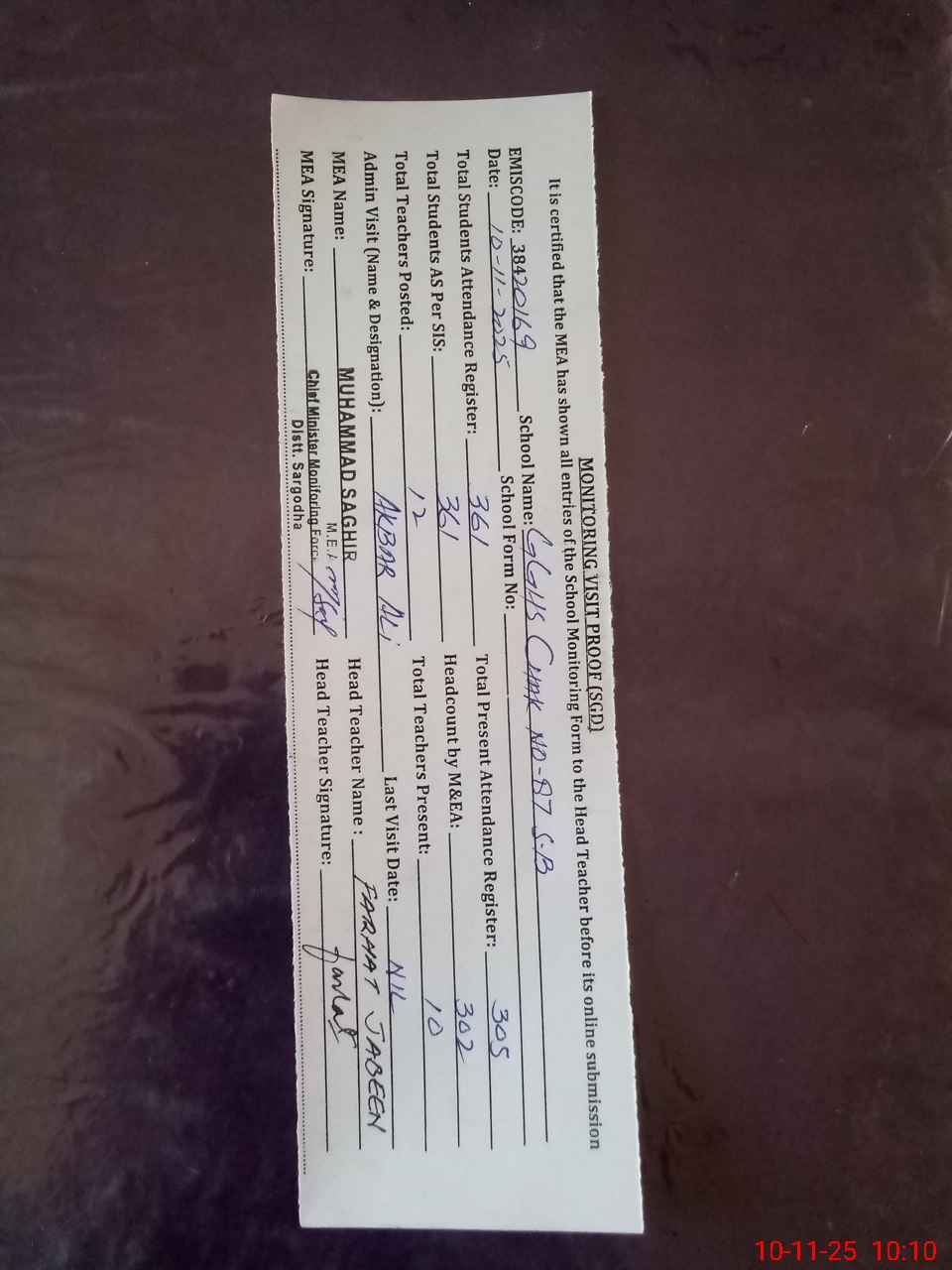 | EMIS Code: 38420169 | Name of School: GGHS CHAK NO.87 SB | |||