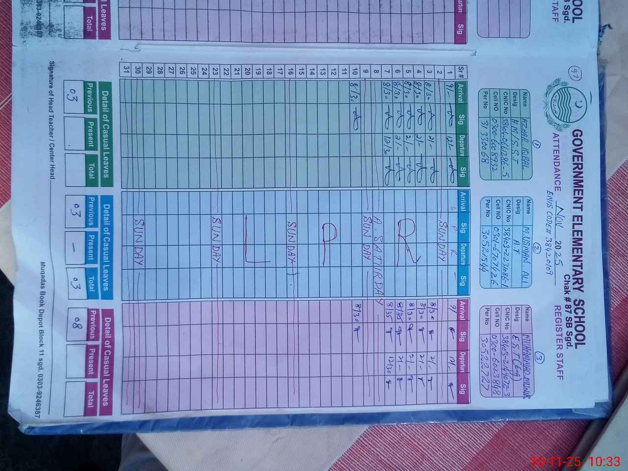 | CNIC | Full Name | Designation | R/C | Absence During Last Calender Month |