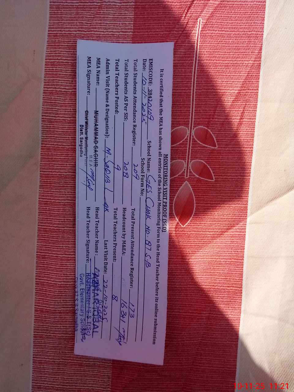 | Attendance Register | Head Teacher | MEA with School | Visit Proof |