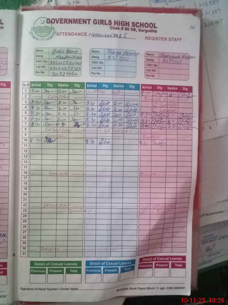 | CNIC | Full Name | Designation | R/C | Absence During Last Calender Month |