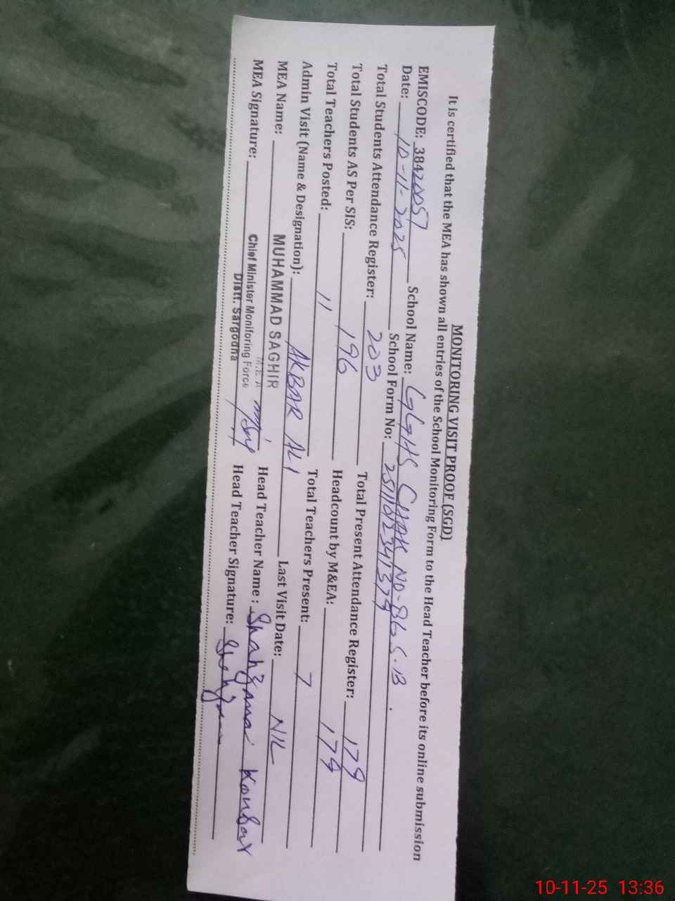 | Attendance Register | Head Teacher | MEA with School | Visit Proof |