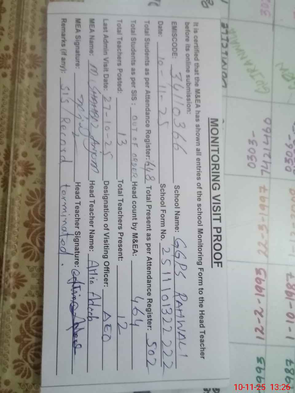 | Certified that this School was Inspected by the Undersigned MEA/DMO Today and the Information Stated Above is as Per Record. | |||||