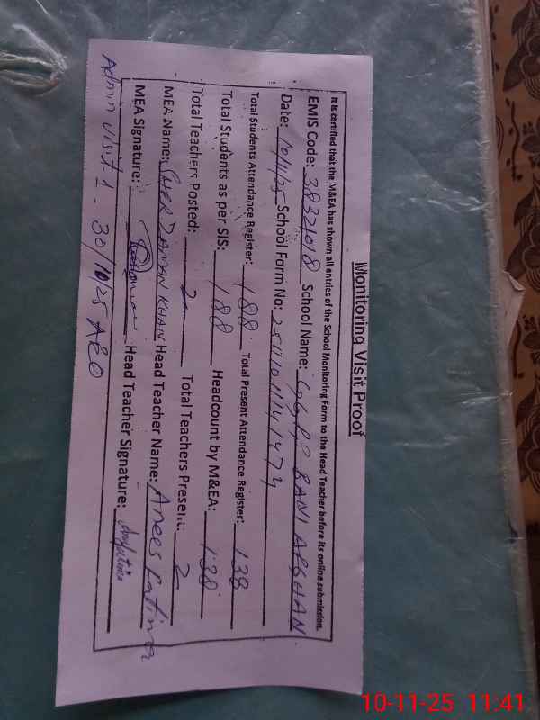 | EMIS Code: 38321018 | Name of School: GGPS BANI AFGHAN | |||