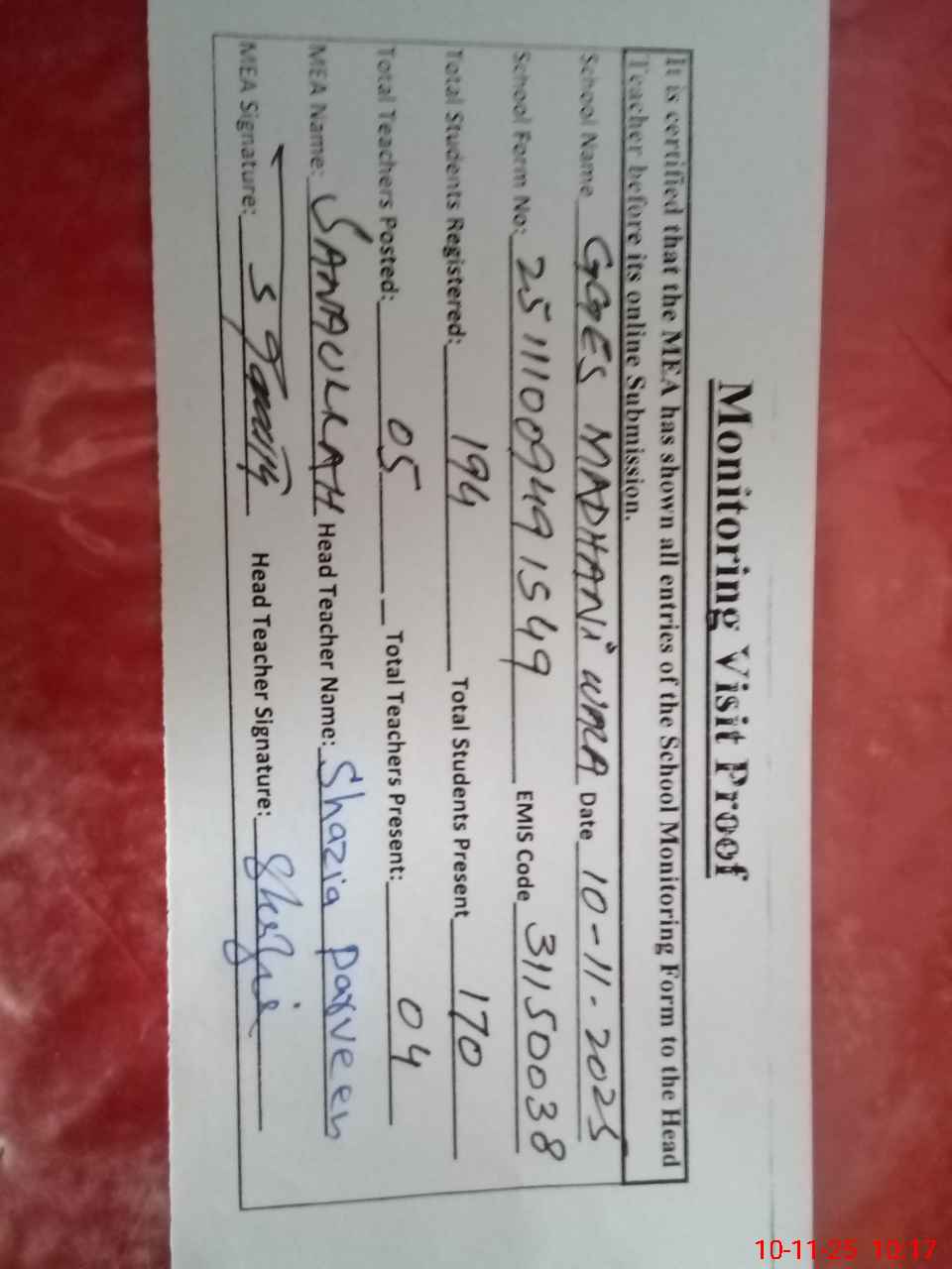 | EMIS Code: 31150038 | Name of School: GGES MADHAANI WALA | |||