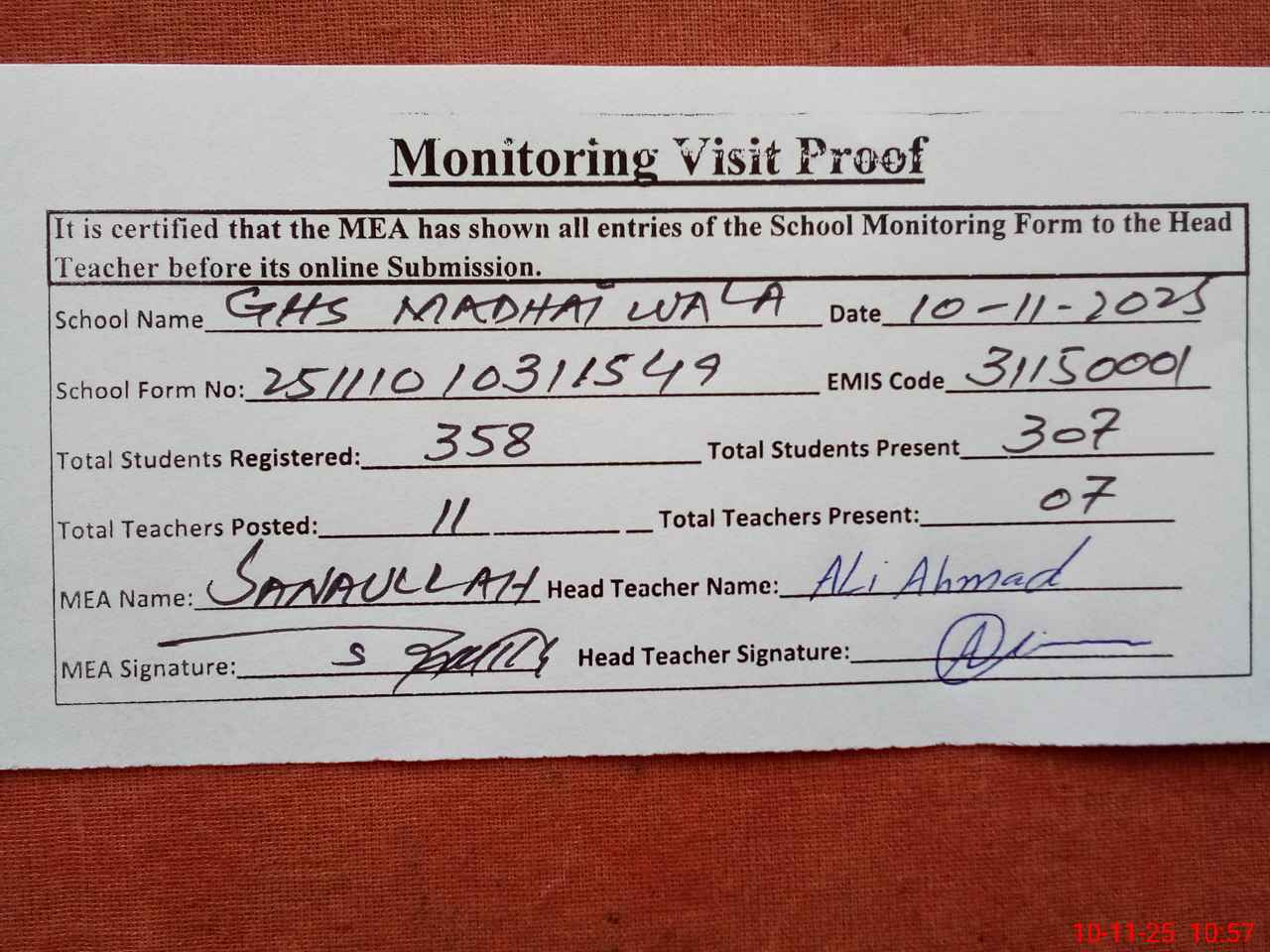 | Attendance Register | Head Teacher | MEA with School | Visit Proof |