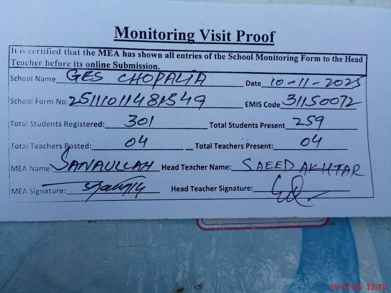 | Attendance Register | Head Teacher | MEA with School | Visit Proof |