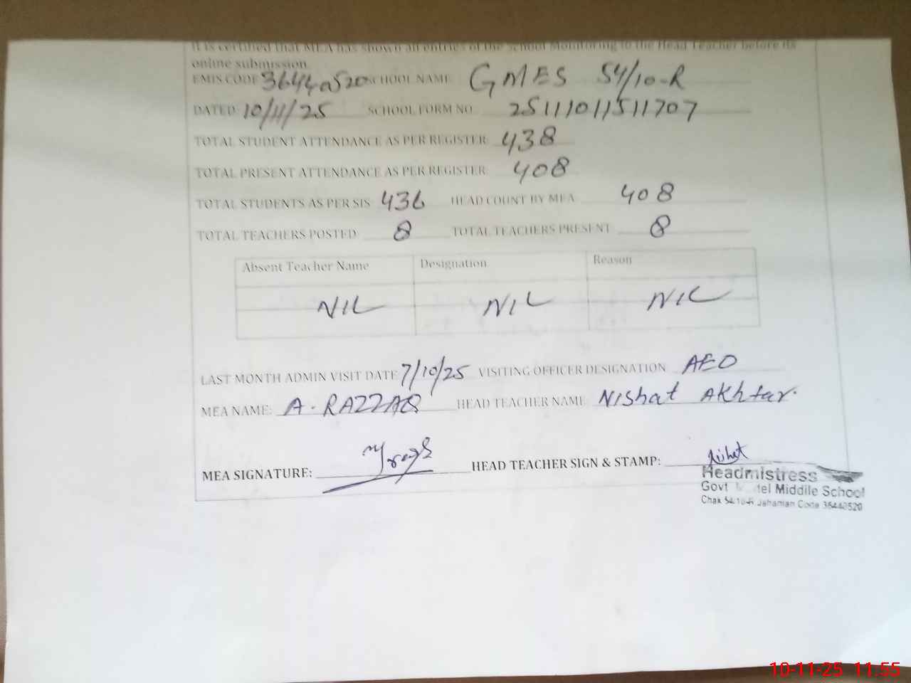 | Attendance Register | Head Teacher | MEA with School | Visit Proof |