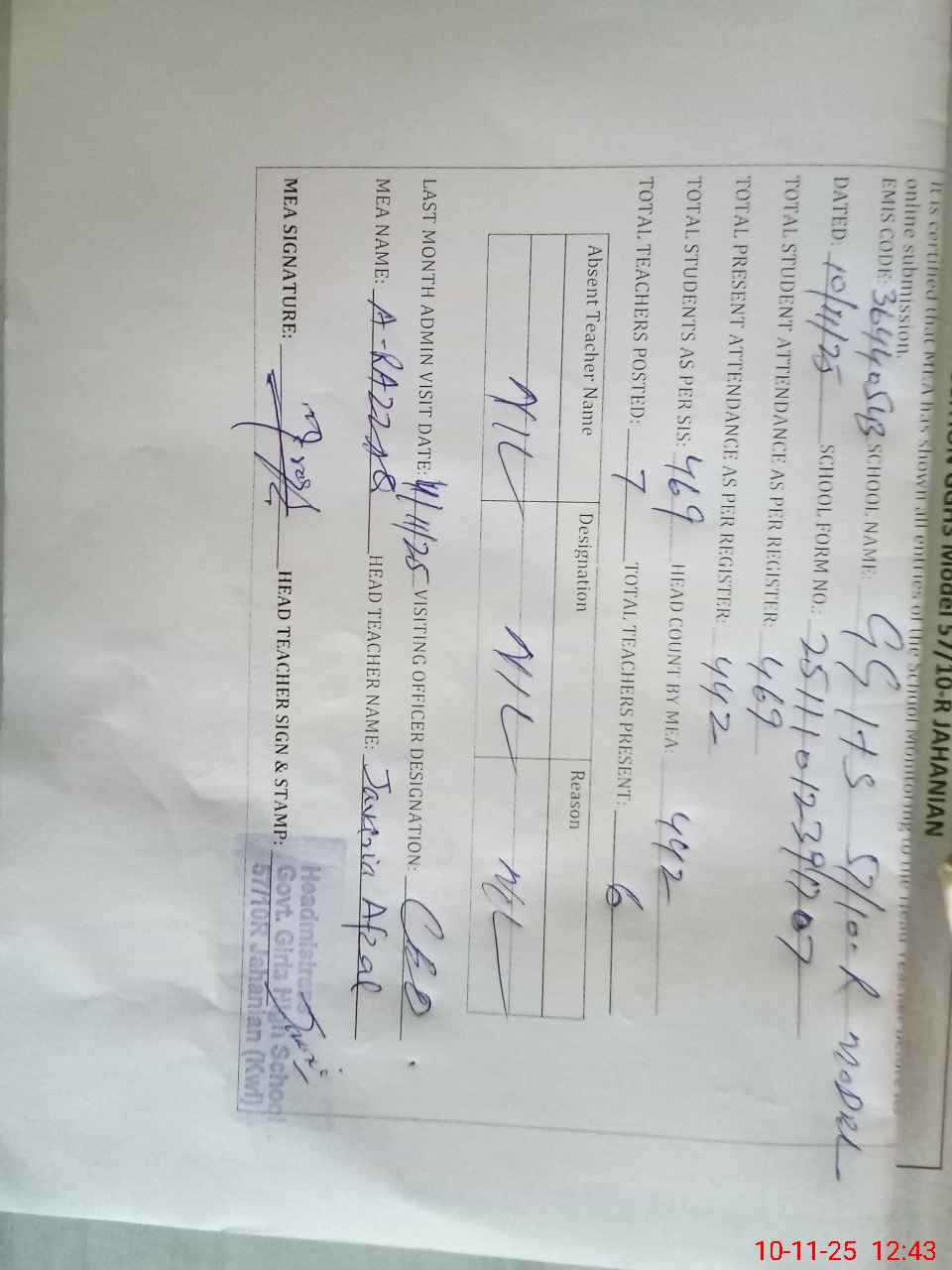 | Attendance Register | Head Teacher | MEA with School | Visit Proof |