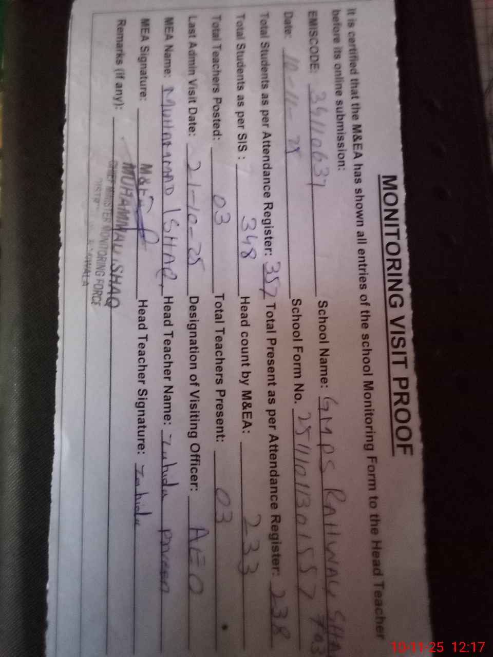 | Attendance Register | Head Teacher | MEA with School | Visit Proof |