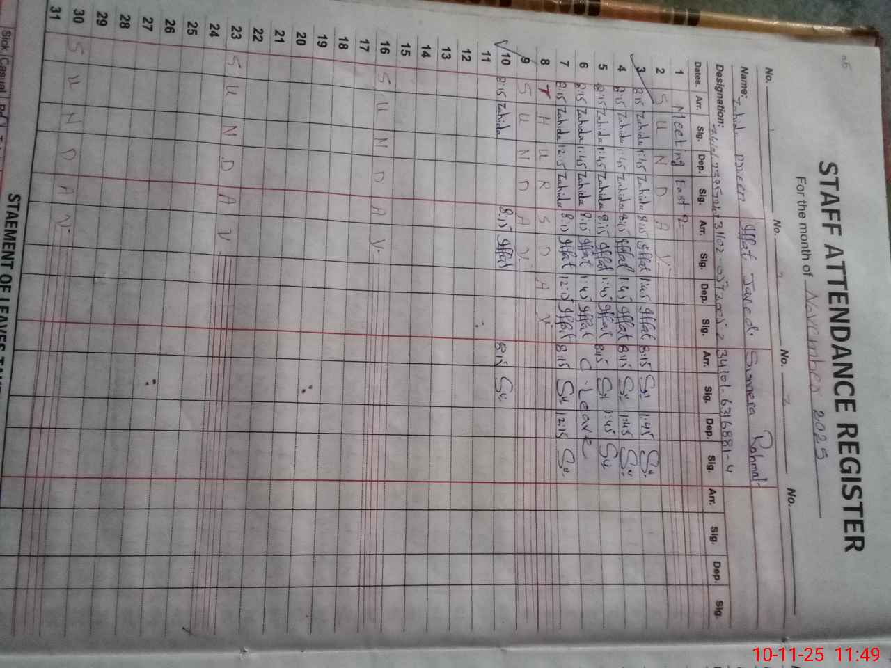 | CNIC | Full Name | Designation | R/C | Absence During Last Calender Month |