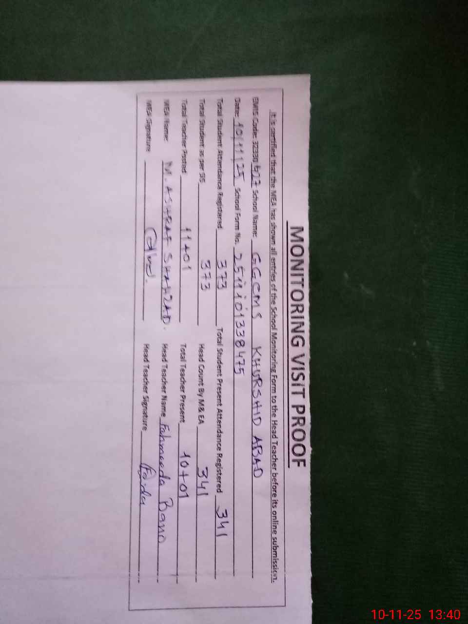 | Attendance Register | Head Teacher | MEA with School | Visit Proof |