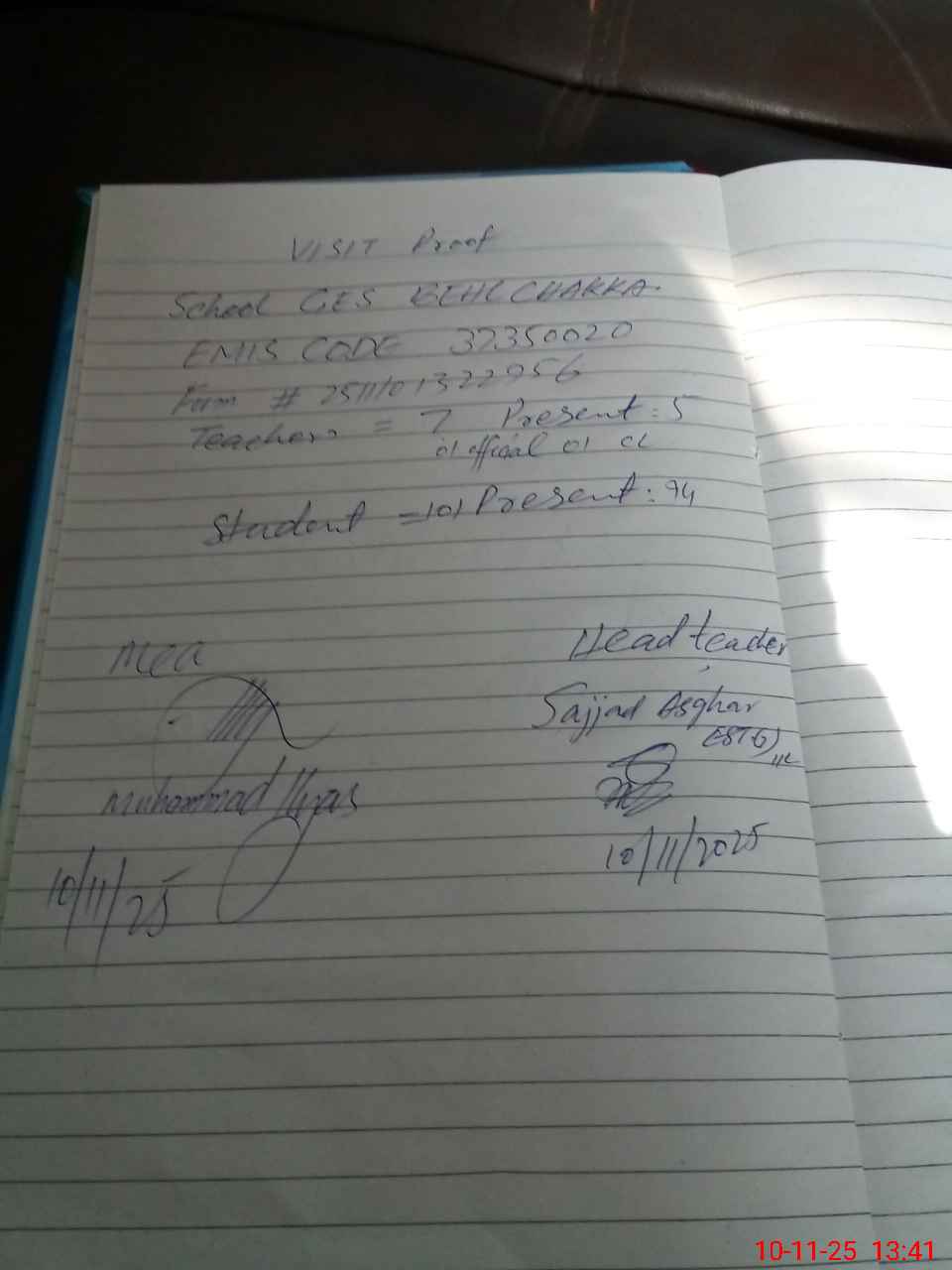 | Attendance Register | Head Teacher | MEA with School | Visit Proof |