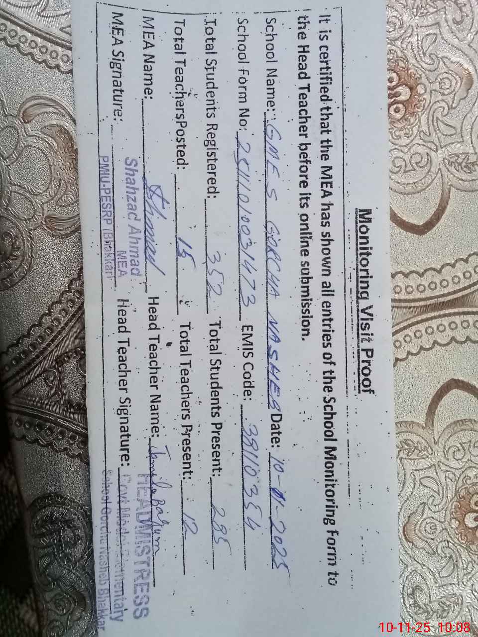 | Remarks (Use Separate Page if Required): Last visit Rehana Batool AEO 10 November 2025 | |||||