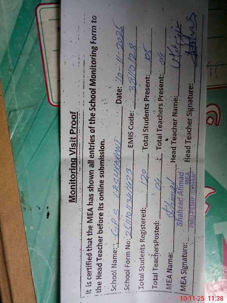 | Remarks (Use Separate Page if Required): Last visit Ziaur Rehman AEO 20 October 2025 | |||||