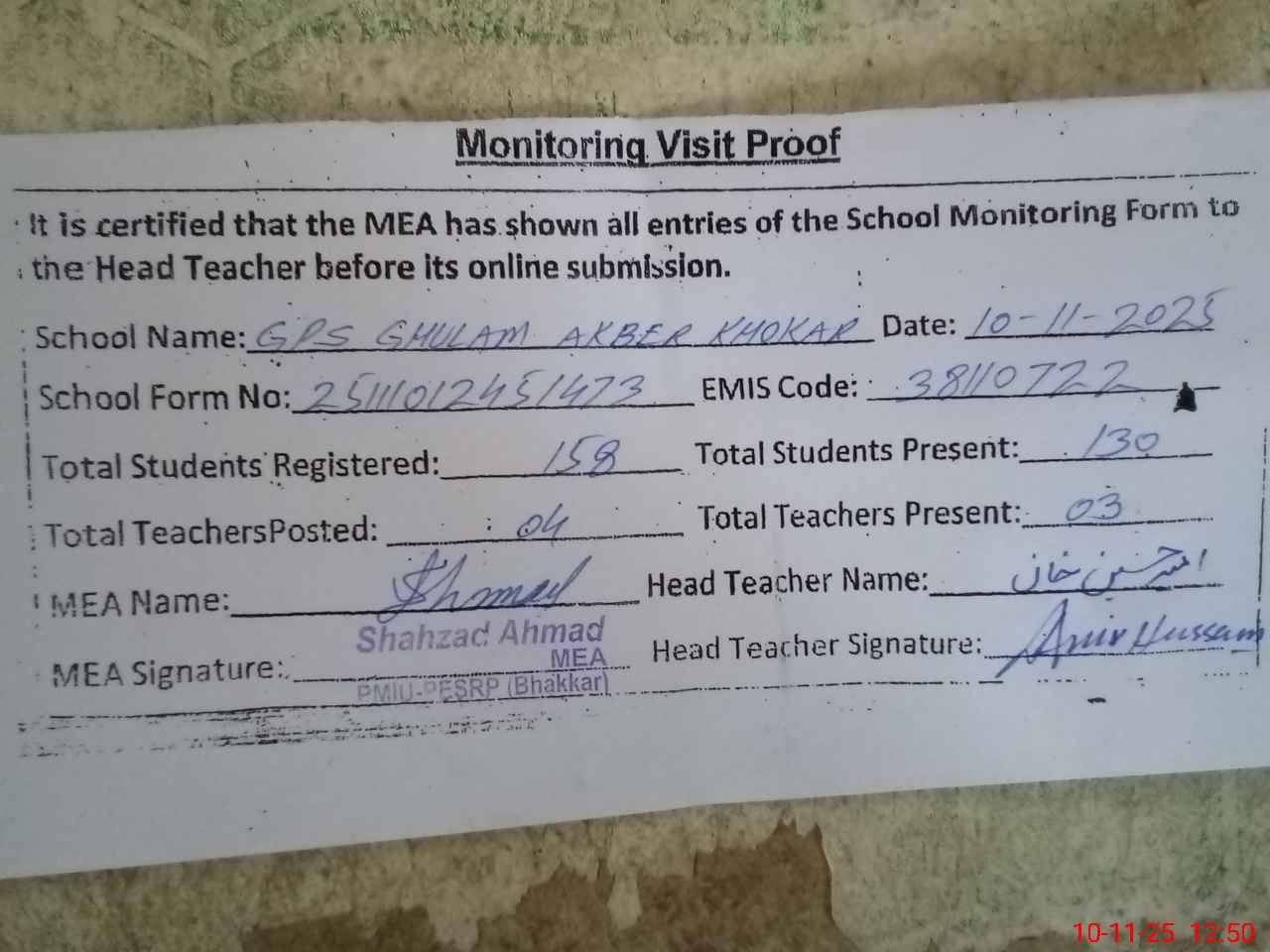 | Remarks (Use Separate Page if Required): Last visit Ziaur Rehman AEO 20 October 2025 | |||||