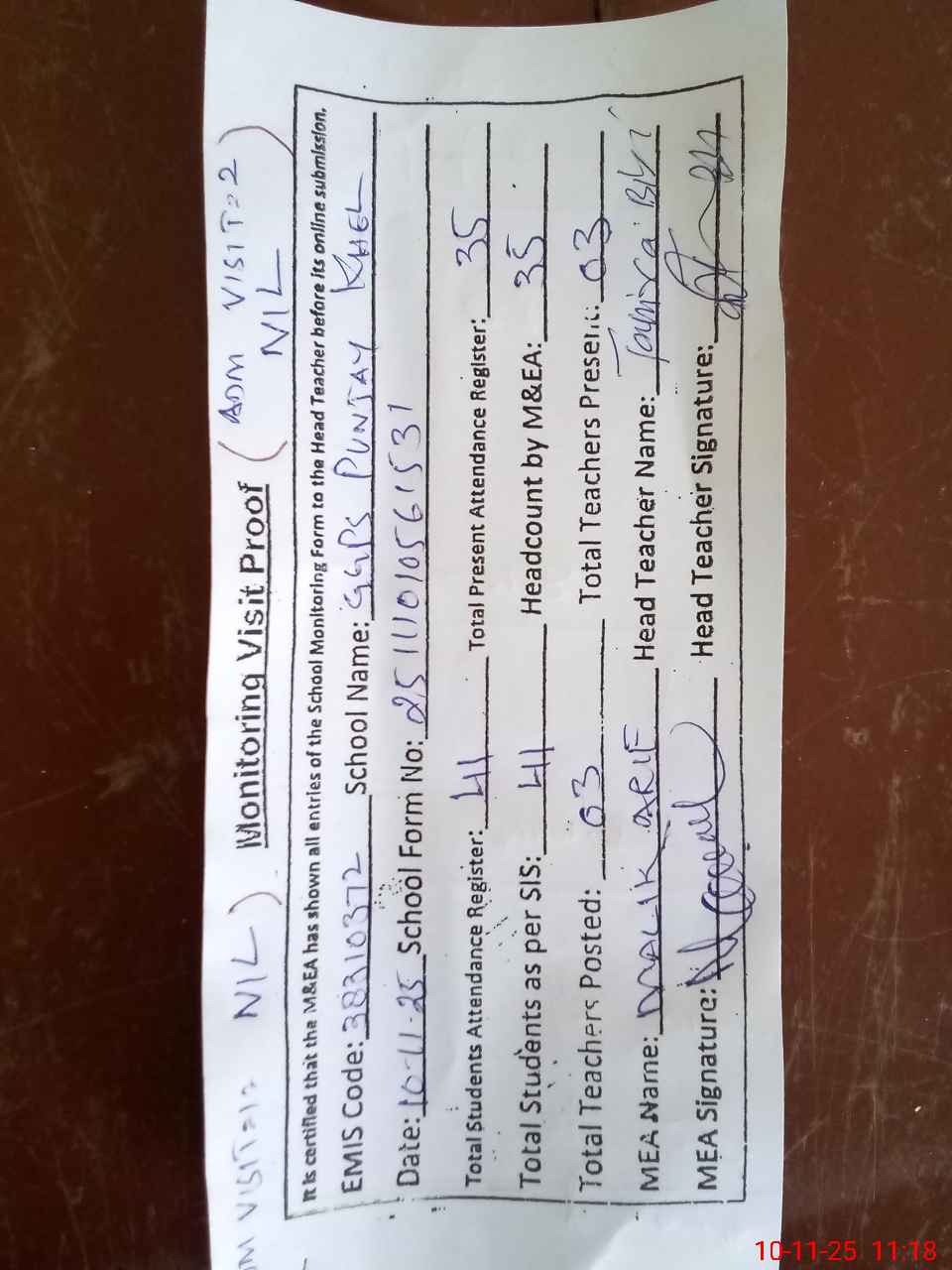 | Attendance Register | Head Teacher | MEA with School | Visit Proof |