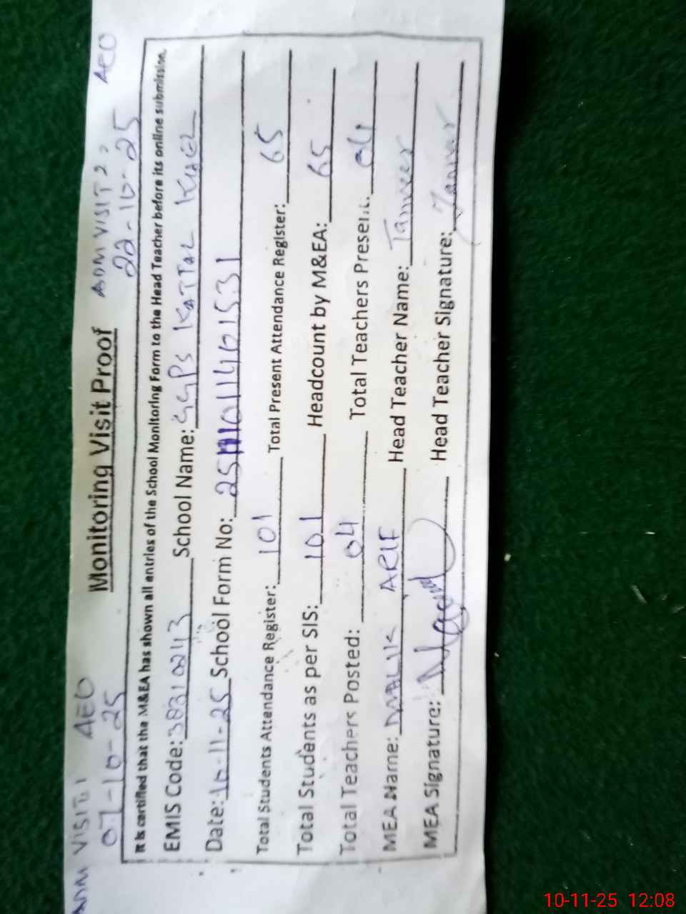 | Attendance Register | Head Teacher | MEA with School | Visit Proof |